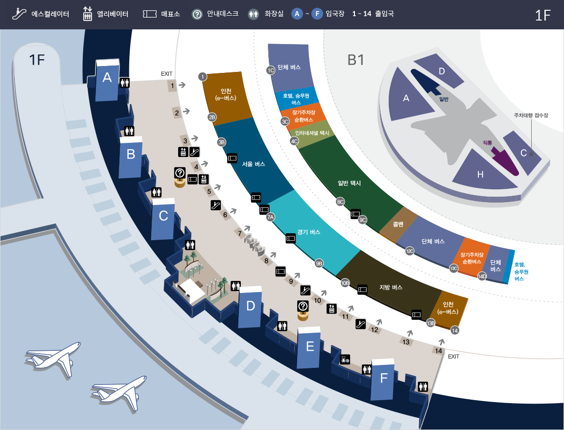 1층 도착장에 위치하고 있으며, 내·외국인 출입국심사대, 세관 심사대, 대중교통 센터 등이 위치하고 있습니다.