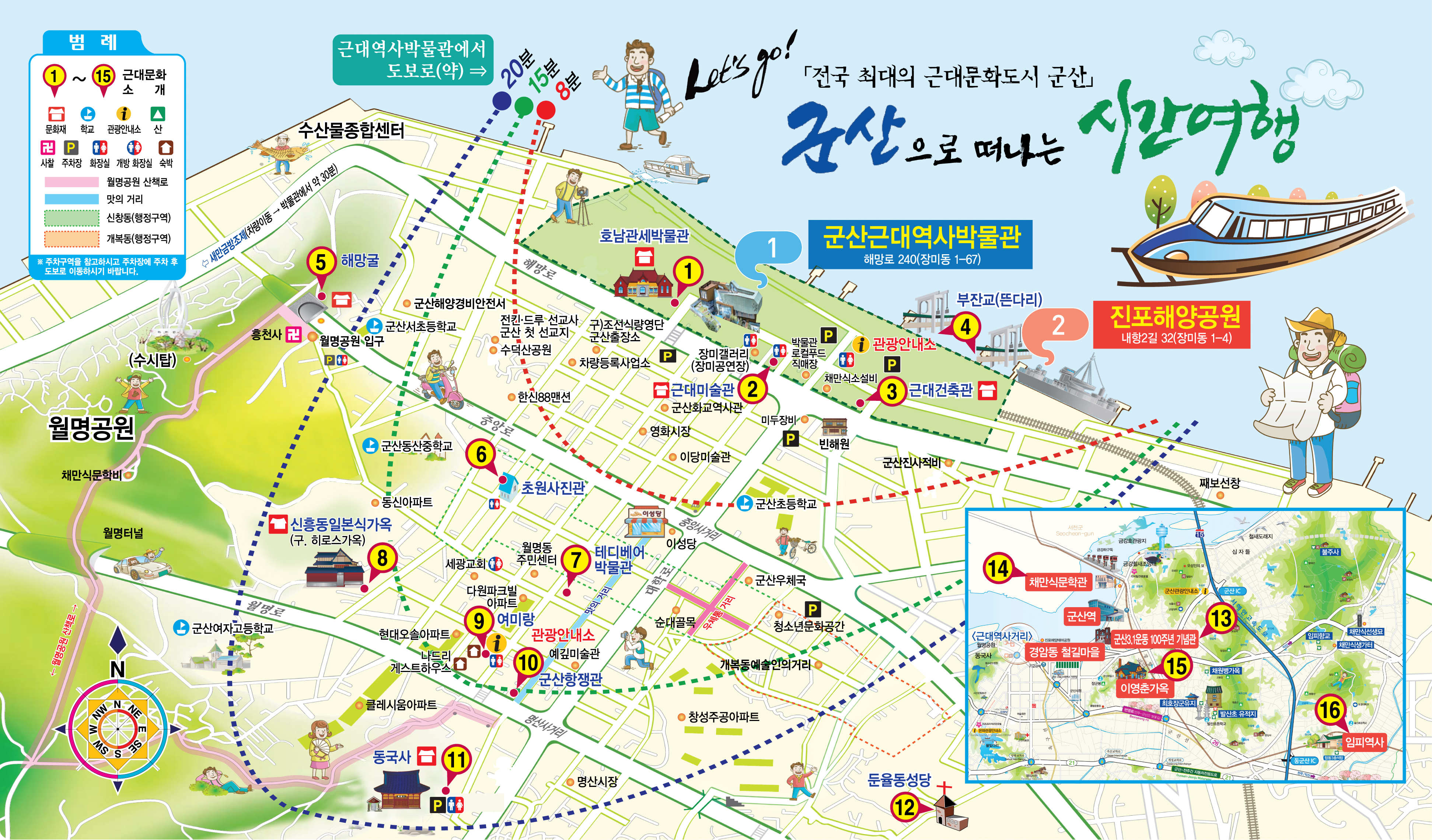 군산 해망굴群山 海望堀Haemanggul Tunnel, Gunsan국가등록문화재 1926년 건립군산 해망굴은 1926년 군산 중앙로와 수산업 중심지 해망동을 연결하기 위해 만든 토목 구조물이다. 구조물은 높이가 4.5m, 길이가 131m에 이르는 반원형 터널이다.일제강점기에는 이곳 가까운 곳에 군산신사, 신사광장현서초등학교, 공회당, 도립군산의료원, 안국사현 흥천사 등이 있어 교통의 요충지가 되기도 하였다. 한국전쟁 중에는 해망굴 안에 북한군 지휘 본부가 자리하였는데 그 때문에 이곳은 연합군 공군기의 공격을 받았다. 그때의 흔적이 지금까지 남아 있다. 이곳은 군산의 근현대사를 보여 주는 소중한 문화유산이다.